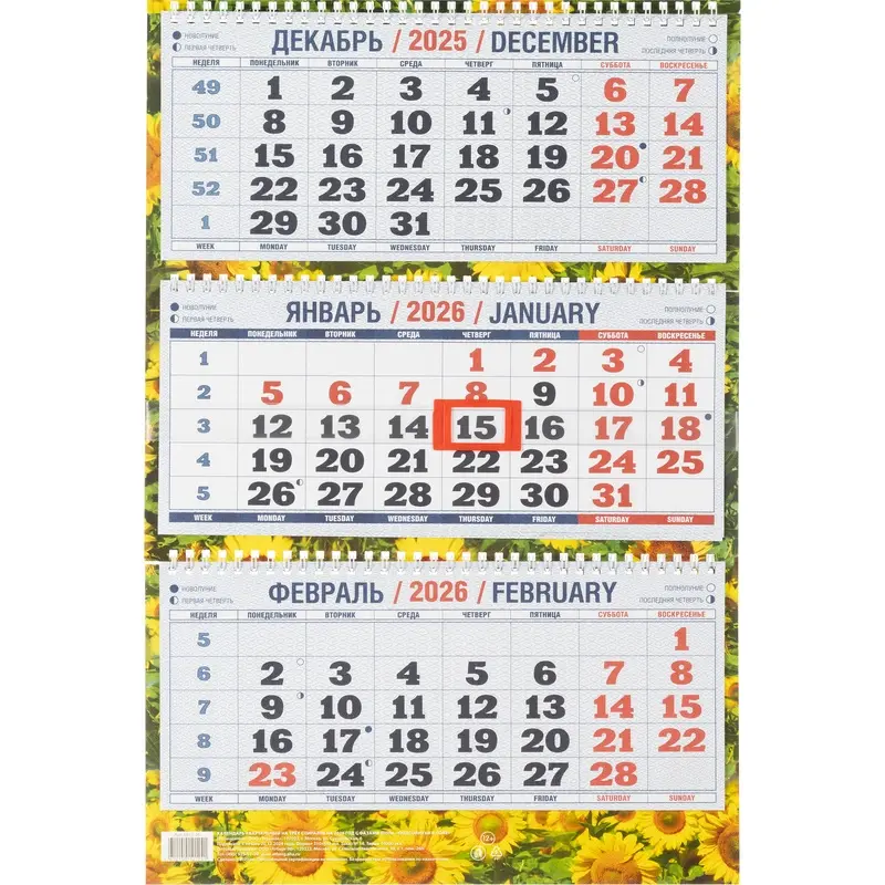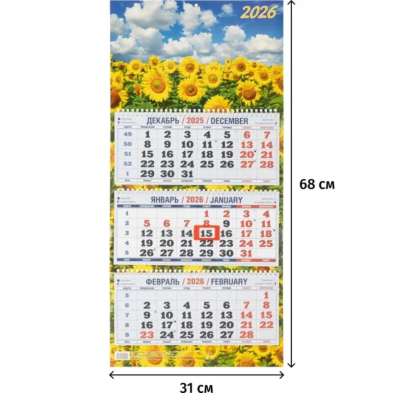Календарь настенный 3-х блочный 2026 Подсолнухи в поле 31x68 см