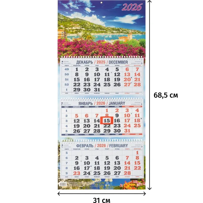 Календарь настенный 3-х блочный 2026 Лазурный берег 31x68.5 см