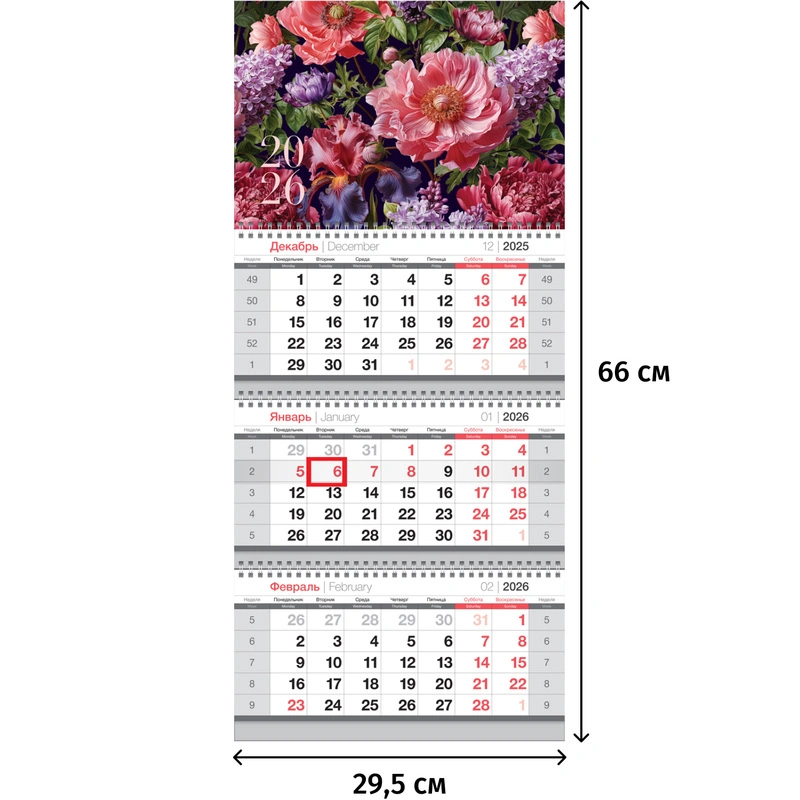 Календарь настенный 3-х блочный квартальный 2026 год Цветы 29.5x66 см