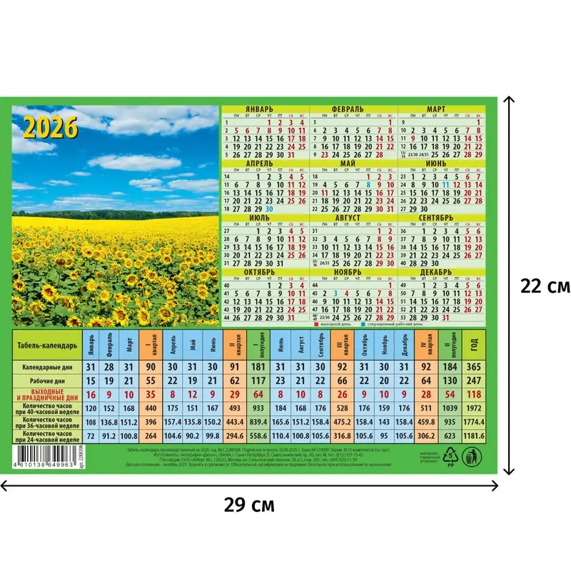 Календарь листовой 2026 Табель 29x22 см, 1 шт