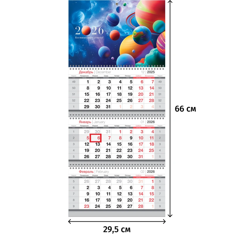 Календарь настенный 3-х блочный квартальный 2026 год Планеты 29.5x66 см