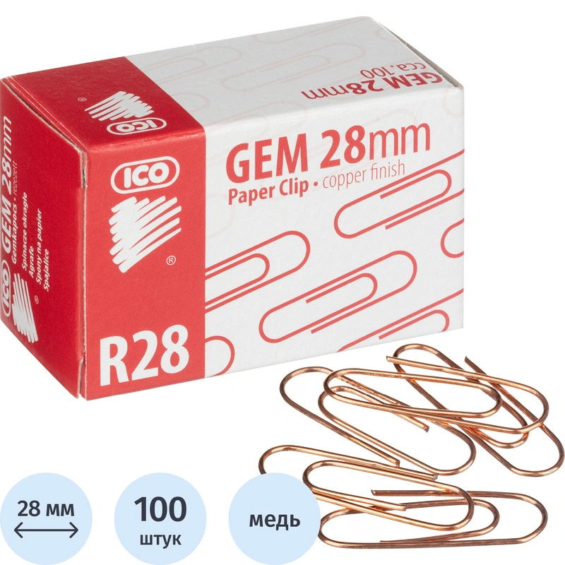 Скрепки ICO металлические омедненные 28 мм (100 штук в упаковке)