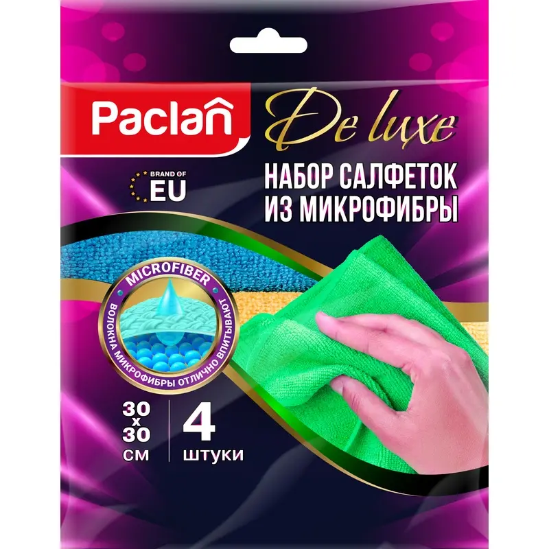 Салфетки хозяйственные Paclan DeLUXE микрофибра 30x30 см 4 штуки в упаковке