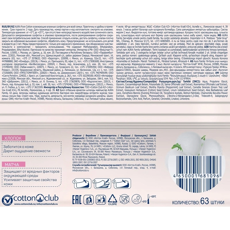 Влажные салфетки освежающие Aura 63 штуки в упаковке