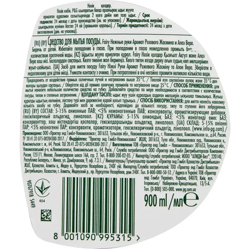 Средство для мытья посуды Fairy Розовый Жасмин и Алоэ Вера, 900мл