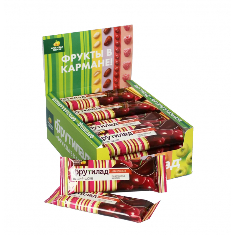 Фруктовый батончик глазированный "Фрутилад Вишня-Шоко". Натуральный фруктовый батончик Фрутилад 'Вишня-шоко' на основе кураги с ароматной вишней в шоколадной глазури. - Высокое содержание пищевых волокон; - Натуральный продукт; - Без ароматизаторов; - Без консервантов. Фрутилад - батончик для тех, у кого каждая минута на счету. В машине, на улице, в офисе, на учебе - фруктовый батончик удобно есть в любом месте! Состав: абрикос сушеный, глазурь кондитерская (сахар, жир - заменитель масла какао лауринового типа, какао - порошок, эмульгаторы (Е322, Е476), ароматизатор пищевой "Ванилин"), вишня свежемороженая, яблоко сушеное, изюм, яблочное пюре натуральное, фруктоза, стабилизатор гуммиарабик. Пищевая ценность: белки - 3 г, жиры - 6,5 г, углеводы - 67 г. Энергетическая ценность на 100 г: 1450 кДж, 340 ккал. Срок годности: 7 месяцев. Хранить в сухом месте при температуре от 5°С до 25°С и относительной влажности воздуха не более 75%. Вес: 800 г. Страна производства: Россия.