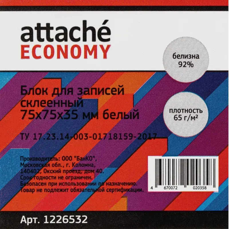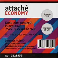 Блок для записей Attache Economy предназначен для работы в офисе или дома. Будет полезен в использовании для рабочих процессов и повседневных задач. Отлично подходит для работников офиса. Блок высотой 3,5 см сложен из квадратных листов размером 7,5х7,5 см. Листы склеены между собой. Листы изготовлены из белой офсетной бумаги плотностью 65 г/м2 и белизной 92%. Блок для записей подходит для письма любыми типами ручек и карандашей. Поставляется в термоусадочной пленке, защищающей блок при транспортировке. Для повышения удобства рекомендуется использование в пластиковых подставках и настольных органайзерах.