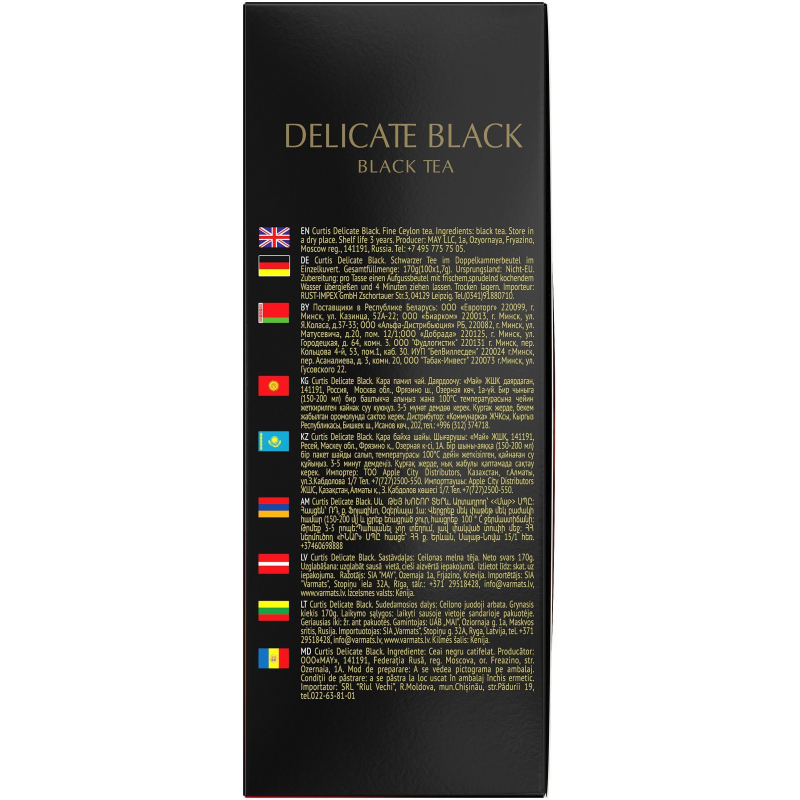 Чай Curtis "Delicate Black" 170 г 100 пакетиков (в сашетах) - черный высокогорный чай с тонким цветочным послевкусием. Найди вдохновение для каждого дня в чашке ароматного чая Curtis Delicate Black. Это идеальный чай для ценителей классики с ярким и полным вкусом. Попробуйте чай Curtis "Elegant Earl Grey" с благородным вкусом цейлонского чая и изысканным ароматом бергамота. Индивидуальная непереносимость пищевых ингредиентов входящих в состав продукта. 1. 100 сашетов. 2. Яркий полный вкус. 3. Насыщенный цвет настоя. 4. Продолжительное приятное послевкусие с цветочными нотами. 5. Высокогорный черный байховый чай. Удивительные сорта чая в купажах Curtis, неожиданные сочетания крупных кусочков ягод и фруктов дарят разнообразие изысканных, ярких вкусов и ароматов. Выпить чашку чая Сurtis - это удовольствие от момента побыть с собой и помечтать. Сurtis мотивирует людей мечтать и осуществлять мечты, рожденные за чашкой чая. Curtis. Выбирай для себя. Состав: Чай черный байховый. Способ приготовления: залейте кипятком (100°C) 1 пакетик, заваривайте 4 минуты. Условия хранения: хранить в сухом месте, в плотно закрытой упаковке. Страна производства: Россия.