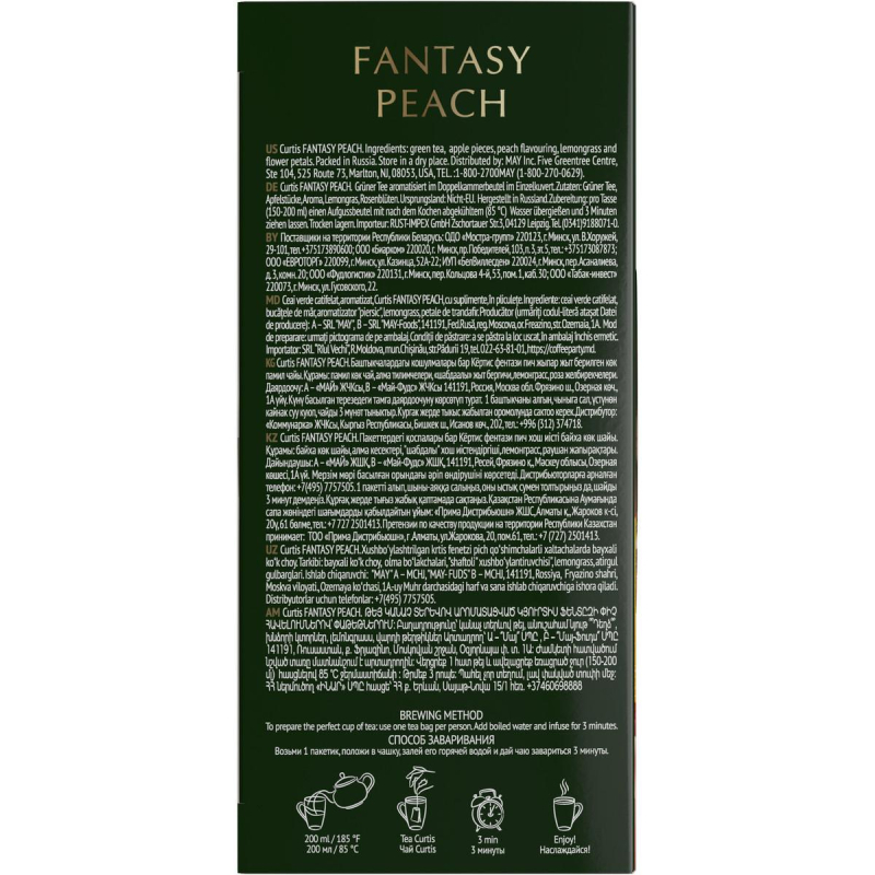 Чай Curtis Fantasy Peach зеленый в пакетиках с ароматом персика, кусочками яблока и лепестками розы. Насладись ярким вкусов для новых открытий. Особенности: 1. Освежающий натуральный аромат персика. 2. Идеальный чай на каждый день. Состав: чай зеленый байховый, кусочки яблок, ароматизатор персик, лемонграсс, лепестки розы. Способ приготовления: заварить чай в заварочном чайнике кипяченой водой и настоять 5 минут. 25 пакетиков в упаковке. Тип упаковки: картонная. Условия хранения: хранить в чистом, хорошо вентилируемом помещении без посторонних запахов при относительной влажности воздуха не более 70%. Страна производства: Россия.