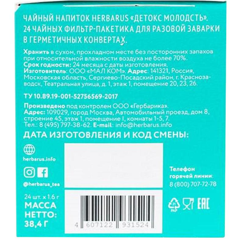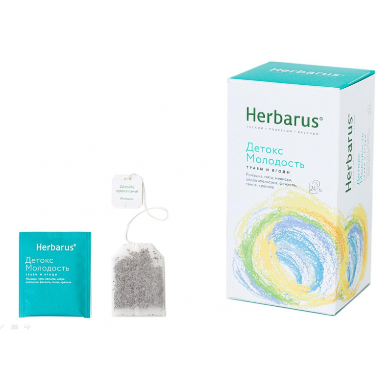 Чайный напиток Herbarus Детокс Молодость 24 пакетика по 1,6 г. Приятное пожелание на каждом ярлыке пакетика. Хорошо сочетается с цветочным медом. Очищает сосуды, выводит токсины и шлаки, снижает уровень холестерина, растворяет избытки жиров, тормозит процессы старения. Можно пить в любое время дня. Состав: ромашка, мята, мелисса, цедра апельсина, фенхель, сенна, крапива. Способ приготовления: 1 пакетик залить 250 мл воды 95 °C и настоять 7 минут, при заваривании 10 минут - будет содержать оптимальное количество полезных веществ.