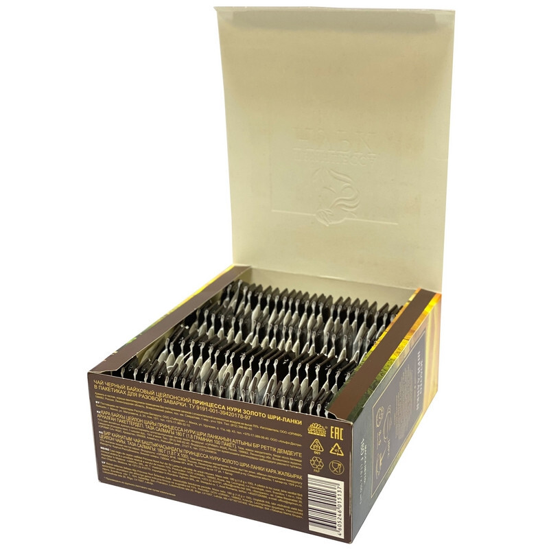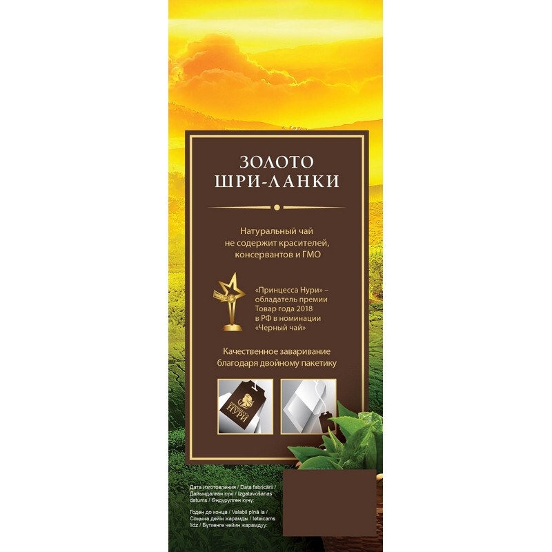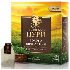 Чай Принцесса Нури Золото Шри-Ланки черный 100 пакетиков - этот чай хранит все лучшее, чем славится знаменитый цейлонский чай, мягкий, сбалансированный вкус с тонкими орехово-пряными нотами, пленительный свежий аромат и яркий прозрачный настой благородного золотисто-янтарного цвета. Состав: чай черный байховый. Способ приготовления: заваривать в горячей воде при температуре 100°C в течении 3-5 минут. Тип упаковки: картонная коробка. Хранить в чистом, хорошо вентилируемом помещении без посторонних запахов с относительной влажностью воздуха не выше 70%. Страна производства: Россия