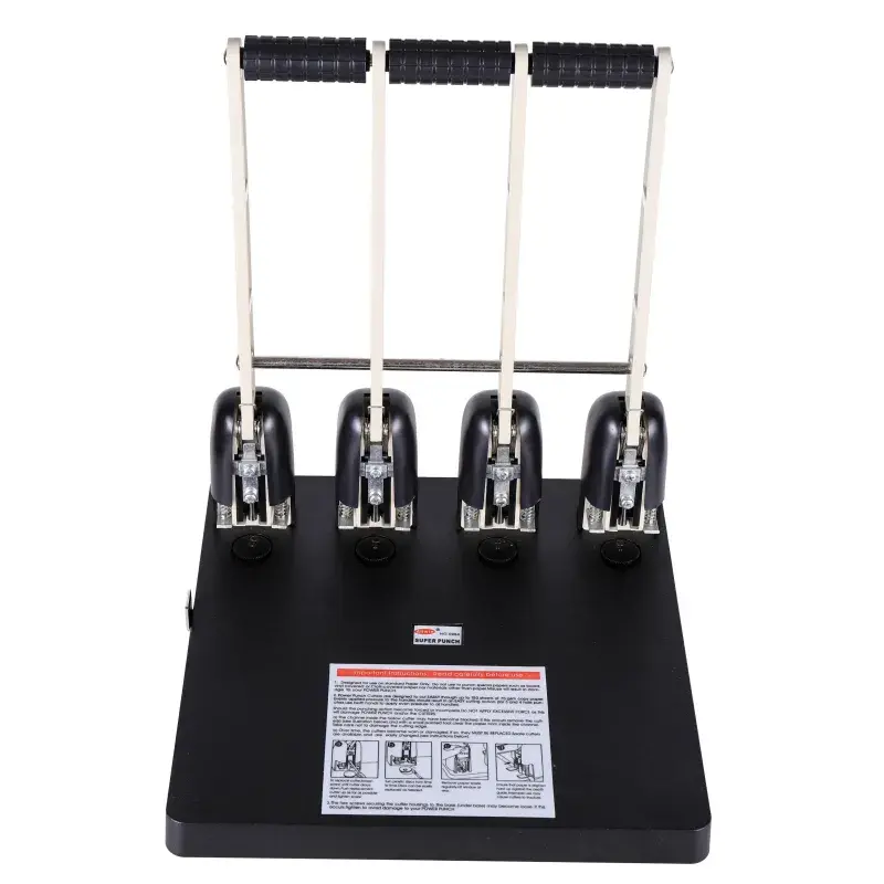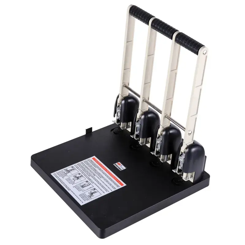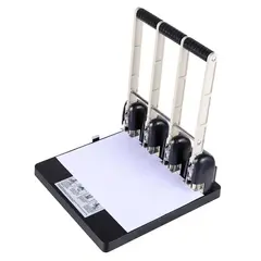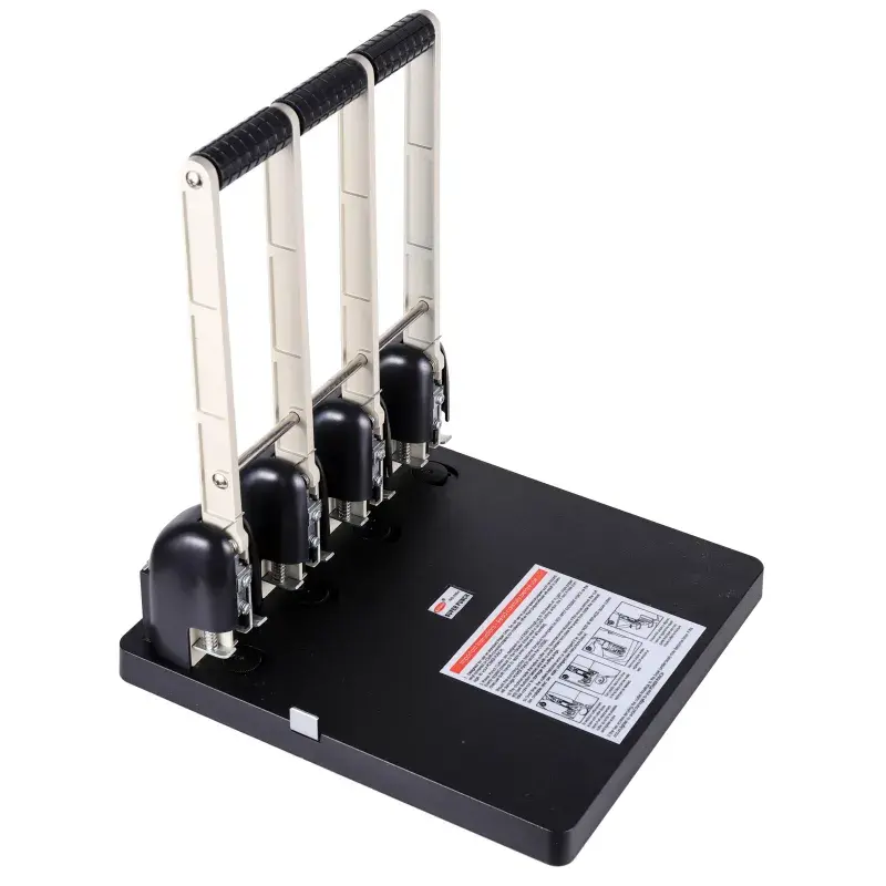 Дырокол мощный Attache обладает пластиковым корпусом черного цвета. Для удобства эксплуатации снабжен высоким рычагом пружинного действия и оснащен стальным рабочим механизмом для одновременного пробивания 4-х отверстий диаметром 6 мм. Дырокол одновременно перфорирует до 150 листов бумаги плотностью до 80 г/кв.м. Расстояние между каждой парой пробиваемых отверстий: 80 мм. Контейнер для конфетти легко открывается и закрывается, исключая рассыпание бумажных остатков. Для эффективного пробивания максимально допустимого объема бумаги необходимо расположить дырокол на горизонтальной твердой поверхности, прикладывая усилия, плавно надавить на рычаг (при необходимости двумя руками), разномерно распределяя усилия по поверхности рычага.