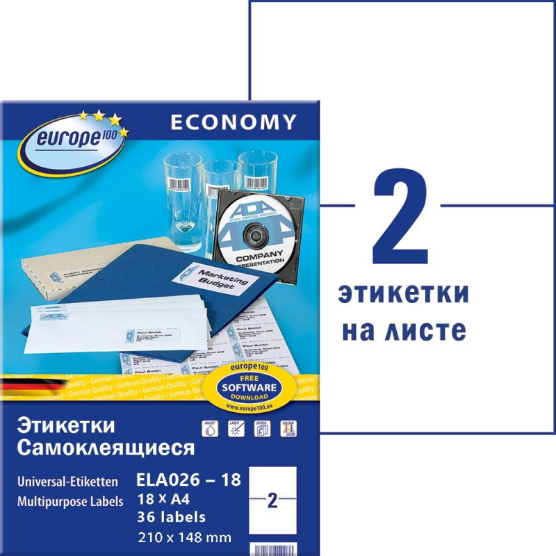 Универсальные этикетки "Европа-100" от Avery Zweckform гарантируют высокое качество исполнения: идеальное решение для любых задач стандартной маркировки. Универсальные самоклеящиеся этикетки Europe 100 производства Avery Zweckform изготовлены из бумаги белого цвета. Экономичная упаковка содержит 18 листов формата А4, на каждом листе - 2 этикетки размером 210x148 мм. - Отличная клейкость: приклеиваются на деревянные, бумажные, пластиковые, стеклянные поверхности. - Лучшее соотношение "цена - качество". - Бесперебойная печать принтера. - Технология QCT не допускает попадания клея в принтер. - Подходят для печати на лазерных, цветных лазерных принтерах и копировальных аппаратах. Для оформления и печати этикеток удобно использовать шаблон в формате Word. Для удобства работы с рисунками необходимо выделить вставленный в шаблон рисунок левой кнопкой мыши, открыть вкладку "Формат" и выбрать режим "Обтекание текстом - По контуру".