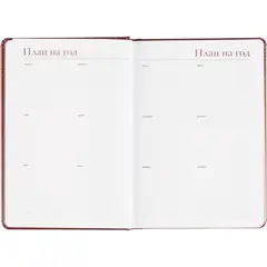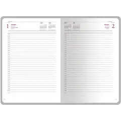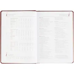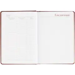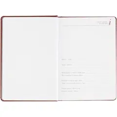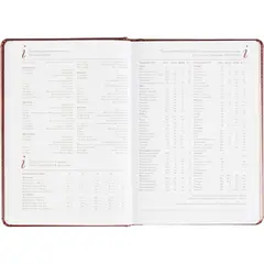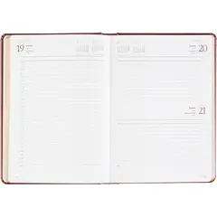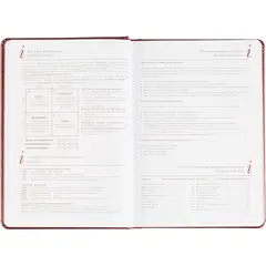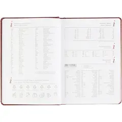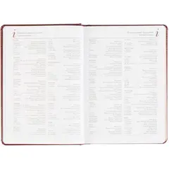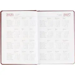 Внутренний блок включает 168 листов белой офсетной бумаги плотностью 70 г/кв.м с линейной разметкой и печатью в две краски. Ежедневник содержит датированную разметку на 2026 год и календарный блок на 2 года, а также раздел со справочной информацией. Цветной золотистый обрез придаёт изделию выразительный внешний вид. Скруглённые углы листов снижают риск повреждения бумаги при ежедневном использовании. Блок зафиксирован с помощью сшивки, что обеспечивает надёжность крепления. Встроенная закладка-ляссе помогает быстро находить нужную страницу.
