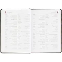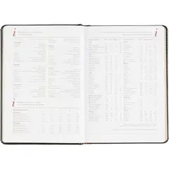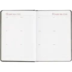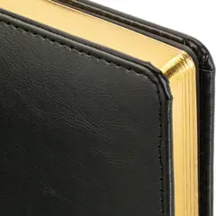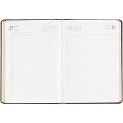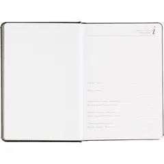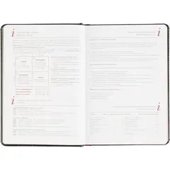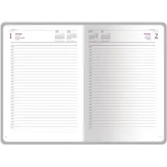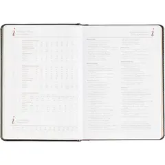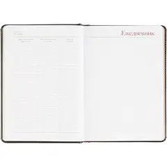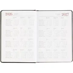 Блок зафиксирован с помощью сшивки, что делает ежедневник устойчивым к износу. Внутри — 168 листов офсетной бумаги плотностью 70 г/кв.м, разлинованных в линейку и оформленных двухцветной печатью. Ежедневник включает датированную разметку на 2026 год и календарный блок на 2 года. Бумага имеет белый цвет, углы листов — скруглённые. Обработка торца золотистым обрезом придаёт модели строгий и статусный вид. Встроенное ляссе позволяет быстро находить нужную страницу.