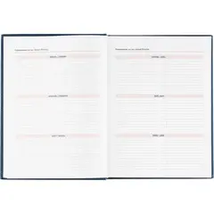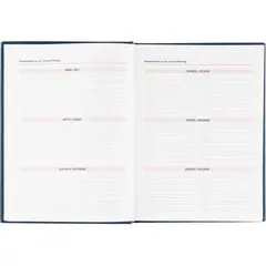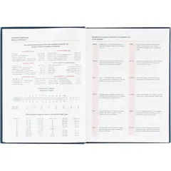 Встроенная закладка-ляссе. Твёрдая обложка с прошивкой по периметру выполнена из искусственной кожи высокого качества. Возможно нанесение логотипа на обложку любым способом тиснения (блинт или фольга).
