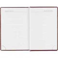 Ежедневник имеет формат A6 и содержит 168 листов. Твёрдая обложка с поролоном, выполненная из высококачественной искусственной кожи бордового цвета, придаёт изделию элегантный и профессиональный вид. Страницы выполнены из белой офсетной бумаги плотностью 70 г/кв.м.