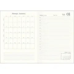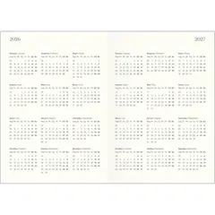 Датированный внутренний блок в линейку на 176 листов (352 страницы) из высококачественной бумаги цвета слоновой кости плотностью 70 г/кв.м. Информационный блок ежедневника включает титульный лист, календари на 2026-2027 гг., раздел «планы на год», развороты для заметок в начале и конце блока, а также планер перед каждым месяцем.