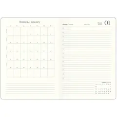 Датированный внутренний блок в линейку на 176 листов (352 страницы) из высококачественной бумаги цвета слоновой кости плотностью 70 г/кв.м. Информационный блок ежедневника включает титульный лист, календари на 2026-2027 гг., раздел «планы на год», развороты для заметок в начале и конце блока, а также планер перед каждым месяцем.