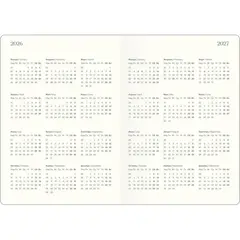 Датированный внутренний блок в линейку на 176 листов (352 страницы) из высококачественной бумаги цвета слоновой кости плотностью 70 г/кв.м. Информационный блок ежедневника включает титульный лист, календари на 2026-2027 гг., раздел «планы на год», развороты для заметок в начале и конце блока, а также планер перед каждым месяцем.