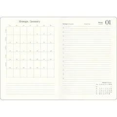 Датированный внутренний блок в линейку на 176 листов (352 страницы) из высококачественной бумаги цвета слоновой кости плотностью 70 г/кв.м с окрашенным в золото обрезом. Информационный блок ежедневника включает в себя: титульный лист, календари на 2026-2027 гг., раздел «планы на год», развороты для заметок в начале и конце блока, планер перед каждым месяцем.