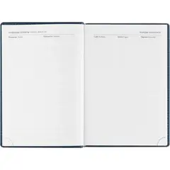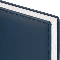 Данный ежедневник имеет формат A5, содержит 176 листов. Твёрдая обложка с поролоном, выполненная из высококачественной искусственной кожи синего цвета, придаёт изделию элегантный и профессиональный вид. Страницы выполнены из белой офсетной бумаги плотностью 70 г/кв.м. Дизайн обложки универсальный. Тип крепления — сшивка. Печать блока в 2 краски. Вид линовки — линейка. Размер: 14.8×21.8 см.