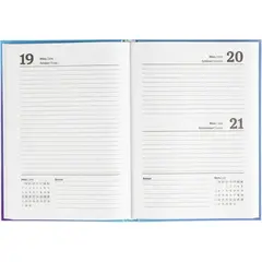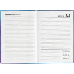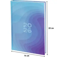 Размер блока составляет 140×200 мм, а размер изделия — 147×206 мм. Ежедневник выполнен в твёрдом переплёте с цветной глянцевой обложкой, что придаёт ему элегантный и универсальный офисный вид. Прошитый тип крепления надёжно удерживает блок.