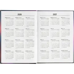 Ежедневник содержит информационно-справочный блок, включая личные данные и календарь на 2026-2029 годы. Он рассчитан на заполнение в течение одного года. В ежедневнике нет петли для ручки.