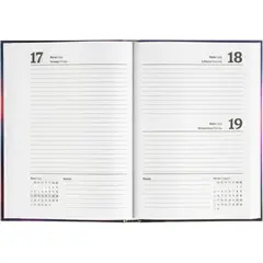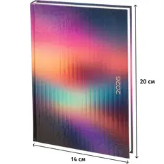 Размер блока составляет 140×200 мм, а размер изделия — 147×206 мм. Ежедневник выполнен в твёрдом переплёте с цветной глянцевой обложкой, что придаёт ему элегантный и универсальный офисный вид. Прошитый тип крепления надёжно удерживает блок.