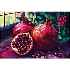 Квартальный календарь BG «Гранат» на 2026 год — помощник в планировании и украшение интерьера. Размер — 295×660 мм. Вертикальный календарь включает три блока, каждый из которых содержит 12 листов. Блоки держатся на трёх гребнях. Листы выполнены из офсетной белой бумаги плотностью 65 г/кв.м с использованием двухцветной печати. Подложка изготовлена из мелованного картона плотностью 320 г/кв.м. Нижняя часть подложки напечатана в один цвет, а верхняя — полноцветная.