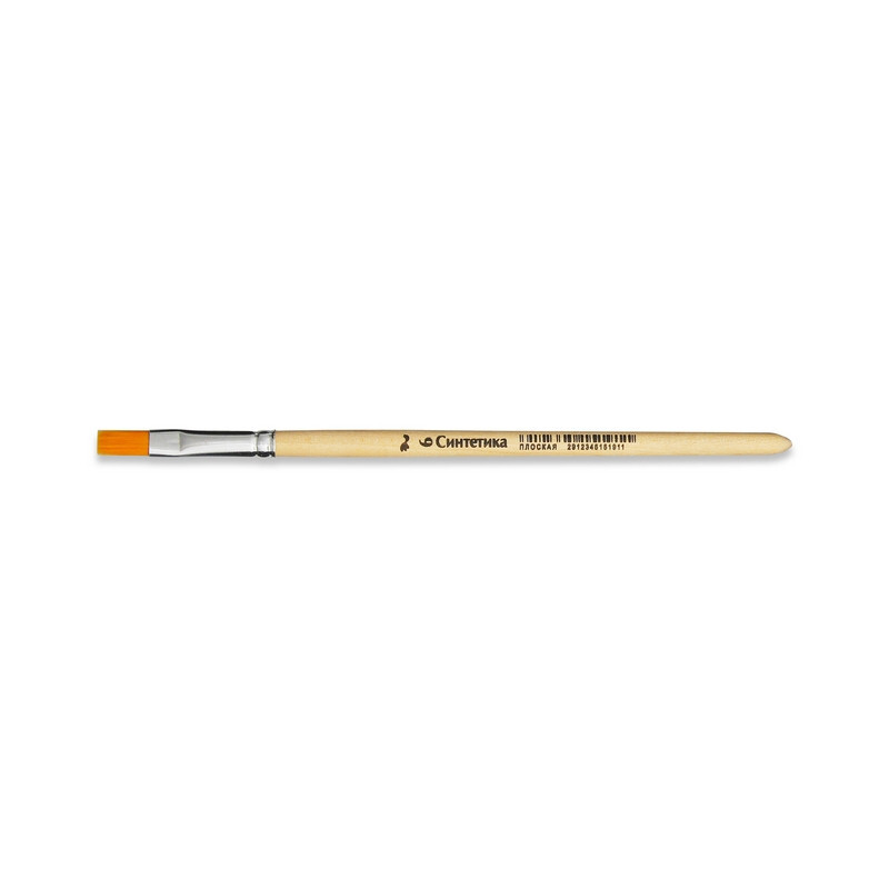 Кисть синтетика плоская № 6. Идентична натуральному колонку по параметрам жёсткости и эластичности. Упругость волоса даже выше, чем у колонка. Однако синтетика уступает колонковым по наполнению кистью водой и объему впитываемой краски. Синтетическими кисточками можно рисовать чёткие и ровные линии. Синтетический волос имеет капиллярный эффект, что позволяет использовать такие кисти даже в акварели. Кисть имеет короткую (14.5 см), деревянную ручку. Кисть предназначена для работы акварелью. Поставляется в полипропиленовом пакете.