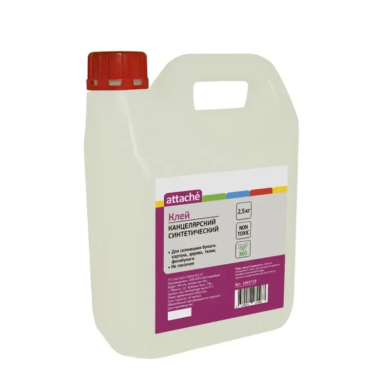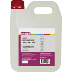 Синтетический канцелярский клей Attache 2,5 кг. Морозостойкий, прозрачный, высокого качества. Предназначен для офисных канцелярских работ по бумаге и картону, а также для приклеивания фотографий. Клей нетоксичен, не содержит растворителей. Способ применения: поверхность перед склеиванием должна быть сухой, без загрязнений. Клей равномерно нанести на склеиваемые поверхности, соединить и прижать. Соединение оставить в сжатом состоянии не менее двух часов. Максимальный эффект достигается путем плотного сжатия склеиваемых поверхностей до полного высыхания. Время полного высыхания - около 24 часов при температуре 20 °С и относительной влажности воздуха 65%.