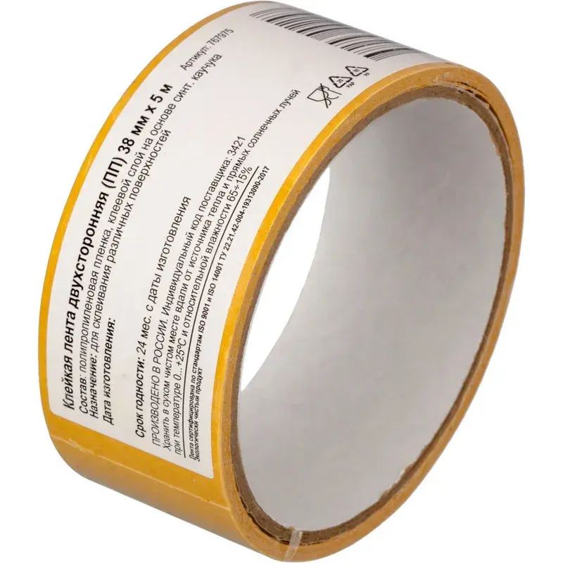 Клейкая лента монтажная на полипропиленовой основе. Клеевой слой на основе синтетического каучука. Ширина - 38 мм, длина - 5 м. Толщина ленты - 95 мкм. Клейкая лента белая. Максимальный вес предмета - 60 г. Используется для склеивания гладких поверхностей и материалов при проведении монтажных, ремонтных, дизайнерских и оформительных работ. Рабочая температура: от 10 до 50 градусов. Количество лент в упаковке: 1 шт. Количество упаковок в транспортном коробе: 48 шт. Цвет защитной отрывной пленки желтый. Перед применением следует удалить данный слой на необходимом для работы участке.