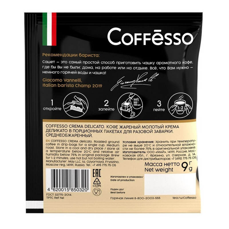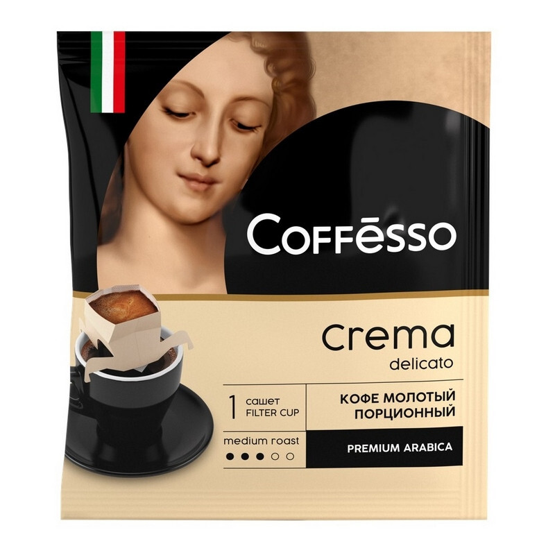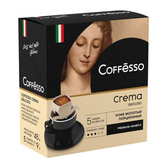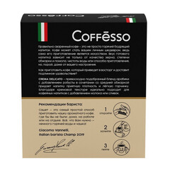 Кофе молотый порционный Coffesso Crema Delicato (5 пакетиков по 9 грамм) - это натуральный молотый кофе в сашетах. Сбалансированная обжарка отборной арабики подарит вам наслаждение изысканным вкусом и утонченным ароматом свежеобжаренного кофе. Приятная бархатная консистенция также доставит удовольствие, а в сочетании с молоком или сливками станет еще более нежной. Уникальные порционные пакеты - сашеты - позволяют выпить настоящий кофе, где бы вы ни находились. Для этого вам потребуется только чашка и кипяток. Это прекрасная возможность наслаждаться любимым напитком для тех, кто привык к ежедневному употреблению кофе, но не готов ни при каких обстоятельствах пить растворимый вариант. Путешествия, поездки в гости, кофе-брейки на мероприятиях, фуршеты на конференциях, перекусы в офисе и даже походы на пикники станут гораздо приятнее и удобнее с возможностью приготовления шикарного бодрящего напитка. В вакуумном пакете вы найдете 5 сашетов по 9 г каждый с подробным описанием и инструкцией по приготовлению. Герметичные сашеты идеально сохраняют вкус и аромат обжаренных и перемолотых зерен в течение нескольких месяцев. Один фильтр-пакет - это целая чашка вашего удовольствия! Состав: 100% арабика. Степень обжарки: средняя. Вид кофе: молотый, порционный. Степень помола: средняя. Способ приготовления: раскрыть сашет, установить на чашку и медленно добавить горячую воду. Вес: 45 г (5 пакетиков по 9 г). Тип упаковки: картонная. Условия хранения: плотно закрытый пакет хранить в сухом прохладном месте. Страна производства: Россия. ГОСТ 32775-2014