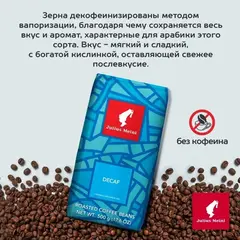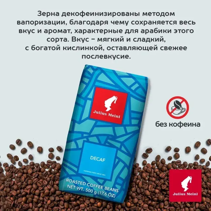Кофе в зернах Julius Meinl Decaf - это идеальный выбор для тех, кто ценит вкус кофе, но избегает кофеина. Декофеинизация осуществляется углекислотным методом, который сохраняет все вкусоароматические свойства зерен. Этот процесс позволяет удалить до 98% кофеина, при этом кофе остается насыщенным и ароматным. Он подходит для употребления в любое время суток, в том числе на ночь, и идеально подходит для приготовления как в кофемашине, так и в турке. Кофе имеет мягкий и сладкий вкус с легкой сбалансированной кислинкой, сохраняющей приятное послевкусие. Средняя обжарка подчеркивает насыщенность и глубину вкуса. Состав: арабика и робуста. Энергетическая ценность: на 100 г - 1 ккал. Рекомендованный способ приготовления: после помола кофе можно готовить любым способом, подбирая степень помола в зависимости от метода приготовления. Условия хранения: хранить при температуре не выше 27°C и относительной влажности не более 75%. Вскрытую упаковку хранить плотно закрытой в сухом прохладном месте. Стандарт производства: система менеджмента безопасности пищевой продукции соответствует международному стандарту ISO 22000. Внешний вид и/или характеристики товара могут быть изменены производителем в соответствии с производственным процессом.