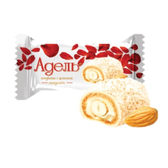 Конфеты Акконд Адель 150 г. Состав: сахар, жир кондитерский (рафинированное дезодорированное растительное масло, антиокислитель - альфа-Токоферол), кокосовая стружка, сухое обезжиренное молоко, орех миндаль, эквивалент масла какао (растительные масла - пальмовое и ши), сыворотка сухая молочная, мука пшеничная, лактоза, обезвоженный молочный жир (пастеризованное молоко), эмульгатор - соевый лецитин, крахмал кукурузный, ароматизаторы, масло кокосовое, яичный порошок, соль, антиокислитель - аскорбиновая кислота. Пищевая ценность на 100 г продукта: белков - 7,8 г, жиров - 42 г, углеводов - 47 г. Энергетическая ценность: 596 ккал. Условия хранения: хранить при Температуре 18+/-3С. Срок годности: 270 дней. Страна: Россия.