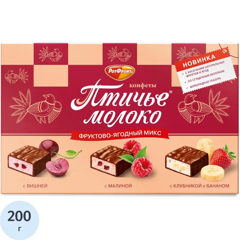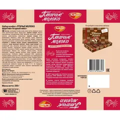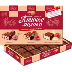 Конфеты Птичье молоко фруктово-ягодный микс 200 г Шоколадные конфеты "Птичье молоко" - это сладкое угощение, предназначенное для употребления в качестве десерта или перекуса. Они прекрасно подходят для чаепитий, праздников и ежедневного наслаждения. Состав: шоколадная глазурь (сахар, какао тёртое, эквивалент масла какао (растительные масла), какао-порошок, эмульгаторы: лецитин соевый, Е476; ароматизатор "Ваниль"), сахар, вода питьевая, патока, заменитель молочного жира (растительные масла, в том числе соевое, пищевые добавки: эмульгатор подсолнечный лецитин, антиокислители: токоферолы, концентрат смеси, аскорбилпальмитат, лимонная кислота), сгущённое с сахаром молоко (молоко нормализованное, сахар (сахароза), сахар молочный (лактоза)), вишнёвые кусочки (концентрированное яблочное пюре, вишнёвое пюре, концентрированный вишнёвый сок, сахар, фруктовый сироп, рисовая мука, пальмовое масло, желирующий агент пектин, лимонная кислота, ароматизатор), фруктовые кусочки "Малина" (концентрированное яблочное пюре, малиновое пюре, фруктозо-глюкозный сироп, глюкозный сироп, сахар, пшеничная клетчатка, загуститель пектин, пальмовый жир, регуляторы кислотности: яблочная кислота, лимонная кислота; красящие компоненты (концентраты: моркови, черники, чёрной смородины), натуральный ароматизатор), белок сухой яичный, фруктовые кусочки "Банан" (банановое пюре, концентрированное пюре груши, концентрированный лимонный сок, фруктозо-глюкозный сироп, глюкозный сироп, влагоудерживающий агент Е422, сахар, пшеничная клетчатка, пальмовый жир, загуститель пектин, регулятор кислотности яблочная кислота, натуральный ароматизатор), фруктовые кусочки "Клубника" (концентрированное яблочное пюре, клубничное пюре, фруктозо-глюкозный сироп, глюкозный сироп, сахар, влагоудерживающий агент Е422, пшеничная клетчатка, пальмовый жир, регулятор кислотности яблочная кислота, загуститель пектин, красящие компоненты (концентраты: моркови, тыквы, черники), натуральный ароматизатор "Клубника", натуральные ароматизаторы), желирующий агент агар, регулятор кислотности лимонная кислота, красители: Е120, Е100; ароматизаторы: "Вишня", "Бисквит ванильный", "Ваниль-Сливки", "Банан"; натуральные ароматизаторы: "Малина тип", "Клубника"; консервант Е202. Противопоказано при индивидуальной непереносимости белка молока и/или яичного белка. Пищевая ценность на 100 г продукта, г (средние значения): белки - 2,5; жиры - 22,0; углеводы - 58,0; пищевые волокна 2,4. Энергетическая ценность на 100 г (средние значения): 1860 кДж (440 ккал). Конфеты подойдут для взрослых и детей старше 3 лет. Хранить при температуре от 15 С до 21 С и относительной влажности не более 70%. Не рекомендуется для людей с индивидуальной непереносимостью белка молока и яичного белка. Внешний вид и/или характеристики товара могут быть изменены производителем в соответствии с производственным процессом.