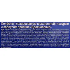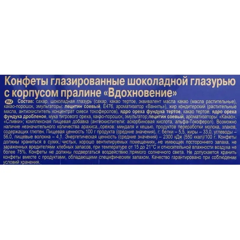 Конфеты шоколадные Вдохновение с дроблёным фундуком 215 г Шоколадные конфеты "Вдохновение" с наполнителем из орехового пралине и кусочками фундука подойдут для сладкого угощения на праздниках и встречах. Они идеально дополнят чаепитие и станут приятным подарком для друзей и близких. Состав: сахар, шоколадная глазурь (сахар, какао тёртое, эквивалент масла какао (масла растительные), какао-порошок, эмульгаторы: лецитин соевый, Е476, ароматизатор "Ваниль"), жир кондитерский (растительные масла, антиокислитель концентрат смеси токоферолов), ядро ореха фундука тёртое, какао тёртое, ядро ореха фундука дроблёное, мука тигрового ореха, какао-порошок, эмульгатор, лецитин соевый, ароматизаторы: "Какао", "Сливки"; комплексная пищевая добавка (антиокислители: аскорбиновая кислота, альфа-Токоферол). Возможно наличие незначительного количества арахиса, орехов: миндаля и кешью, продуктов переработки молока, злаков, содержащих глютен. Пищевая ценность 100 г продукта (средние значения), г: белки - 5,5, жиры - 33,0, углеводы - 56,0, пищевые волокна - 4,1. Энергетическая ценность (средние значения) - 2300 кДж (550 ккал)/100 г. Рекомендуется для потребителей от 3-х лет. Конфеты должны храниться в сухих, чистых, хорошо вентилируемых помещениях, не имеющих постороннего запаха, не заражённых вредителями хлебных запасов, при температуре от 15 С до 21 С и относительной влажности воздуха не более 75%. Конфеты не должны подвергаться воздействию прямого солнечного света. Не допускается хранить конфеты вместе с продуктами, обладающими специфическим запахом. Качество гарантировано при соблюдении условий хранения. Внешний вид и/или характеристики товара могут быть изменены производителем в соответствии с производственным процессом.