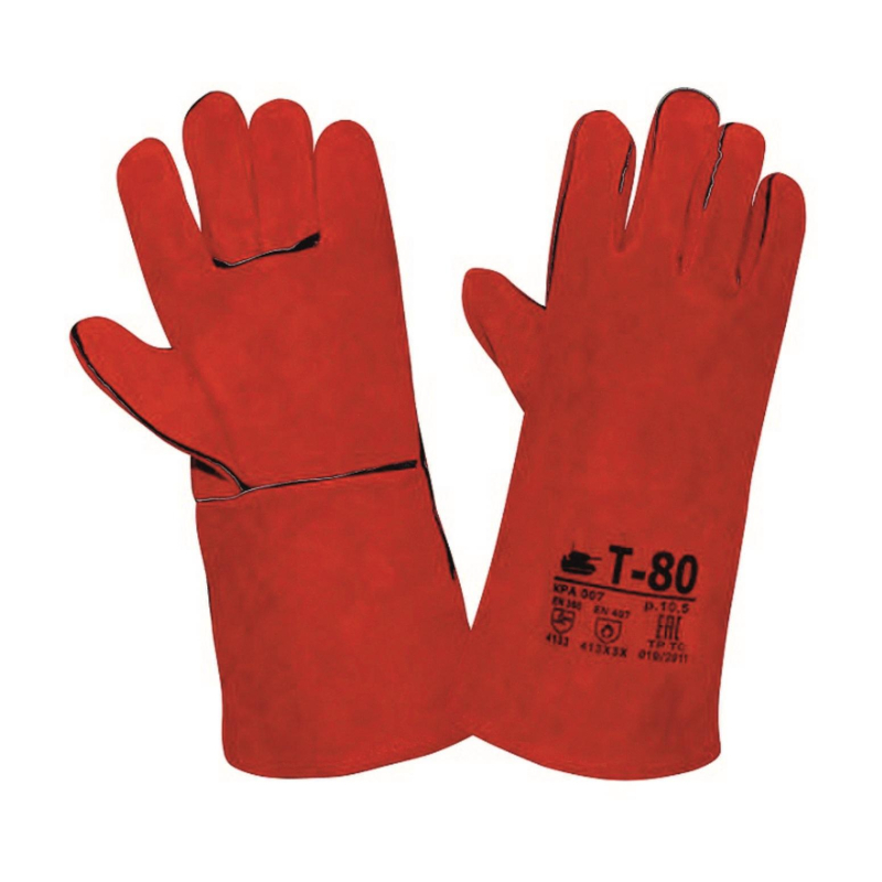 Краги Т-80 спилковые красные с подкладкой из флиса и хлопчатобумажной ткани, длина 350 мм (+10/-5мм). Размер: 10,5. Окрашенный спилок КРС сорта АВ (1,4 +/- 0,2 мм), обработка, обеспечивающая сохранение мягкости спилка в течение длительного времени хранения, швы усилены вставками из кожи, используется специальная упрочненная нить. Перчатки изготавливаются из высококачественного спилка спинной части шкур, прошедшего предварительный отбор. Размер 10,5. Внутри краги имеется вшивной ярлык с дополнительной информацией о продук-ции.