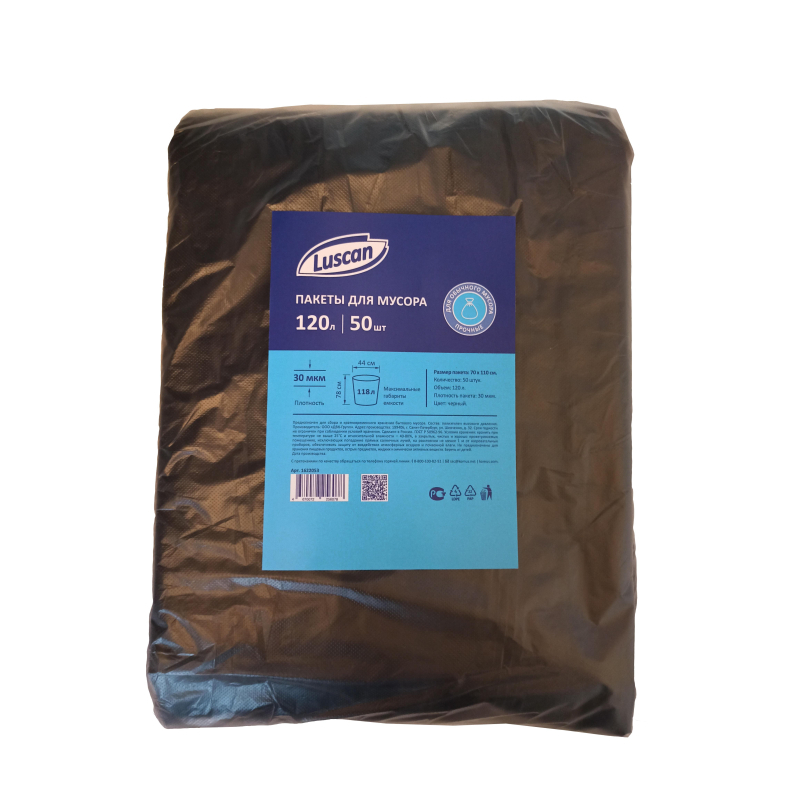Мешки для мусора ПВД 120л 30мкм 50шт/уп черные 70х110см Luscan
