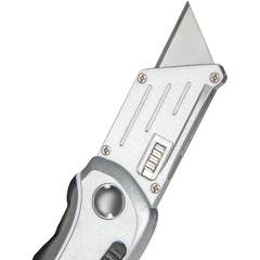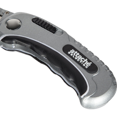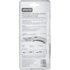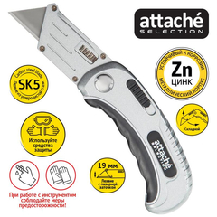 Нож универсальный многофункциональный Attache Selection с трапециевидным лезвием. Используется для резки широкого спектра материалов: ткани, бумаги, кожи, пленки и т. п. Эргономичный, надежный корпус с вставками из термопластичного каучука (TPR вставка) и ударопрочного ABS-пластика препятствуют соскальзыванию пальцев. Особенности изделия:— Корпус выполнен из цинкового сплава — устойчив к коррозии— Трапециевидное лезвие из инструментальной углеродистой стали SK5— Лезвие изготовлено с технологией лазерной заточки, позволяющей создавать ровную и прочную режущую кромку— Надежный металлический держатель— Фиксатор складного держателя трапециевидного лезвияХарактеристики изделия:— Длина ножа 104,0 мм— Ширина лезвия 19,0 мм— Длина лезвия 61,0 мм— Толщина лезвия 0,6 ммСхема замены лезвия:1.Сдвинуть к корпусу фиксатор держателя2. Извлечь затупившееся лезвие3.Перевернуть его другой стороной или заменить на новое4.Установить в держатель и отпустить фиксаторМеры предосторожности: — При работе с лезвиями используйте средства защиты — Не утилизируйте лезвия с бытовыми отходами — Хранить в недоступном для детей месте