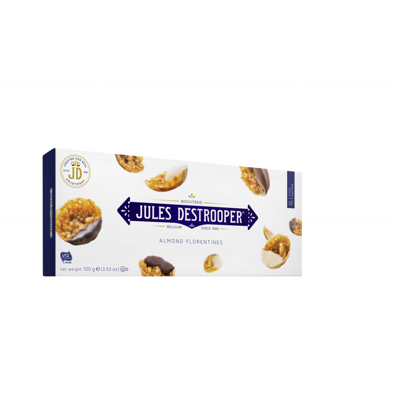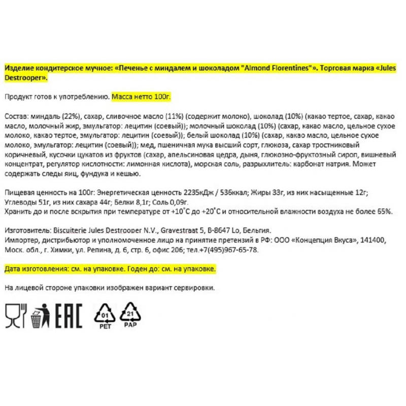 Восхитительное сочетание миндаля, карамелизированных фруктов, Бельгийского шоколада и сливочной карамели. Тонкий привкус орехов, карамели и фруктов. Хрустящее, невероятно нежное печенье. Состав: миндаль (22%), сахар, сливочное масло (11%) (содержит молоко), шоколад (10%) (какао тертое, сахар, какао масло, молочный жир, эмульгатор: лецитин (соевый)); молочный шоколад (10%) (сахар, какао масло, цельное сухое молоко, какао тертое, эмульгатор: лецитин (соевый)); белый шоколад (10%) (сахар, какао масло, цельное сухое молоко, эмульгатор: лецитин (соевый)); мед, пшеничная мука высший сорт, глюкоза, сахар тростниковый коричневый, кусочки цукатов из фруктов (сахар, апельсиновая цедра, дыня, глюкозно-фруктозный сироп, вишневый концентрат, регулятор кислотности: лимонная кислота), морская соль, разрыхлитель: карбонат натрия. Может содержать следы яиц, фундука и кешью. Пищевая ценность: жиры - 33 г, белки - 8,1 г, углеводы - 51 г. Энергетическая ценность: 536 ккал. Срок годности: 12 месяцев. Вес: 100 г. Тип упаковки: картонная. Хранить при температуре от +10 до +24°C. Страна производства: Бельгия.