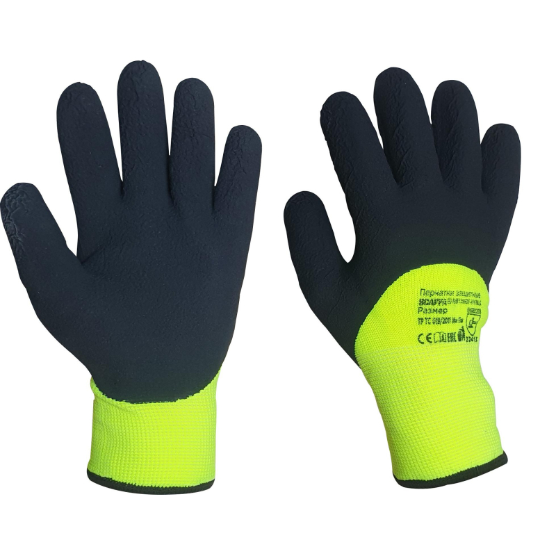Перчатки рабочие утепленные. Размер: 10, XL. Количество в упаковке: 1 пара. Основа: верх - нейлон, внутренний слой - двухслойный акрил. Покрытие: вспененный латекс. Вид покрытия: ладонь и напалки. Манжет: удлиненный напульсник с цветовой индикацией размера. Верхний слой нейлон (13 класс вязки), внутренний двойной акрил (7 класс вязки), обеспечивают отличную теплоизоляцию и комфортную работу в условиях пониженных температур, температура комфорта до -20 С. Покрытие ладони из вспененного латекса обеспечивает превосходный захват во влажной и масляной среде. Удлиненный манжет предотвращает попадание грязи и обеспечивает комфортную температуру. Можно стирать в стиральной машине. Защитные свойства по EN388: 2016: 2241 X.