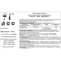 Порошок стиральный Лотос Pro 25 кг. Назначение: предназначено для замачивания, предварительной и основной стирки изделий из хлопчатобумажных, льняных и синтетических волокон. Способ применения: 1.Замачивание: 80-90 г на 10 л воды при температуре 30-50 °С 2-3 часа в зависимости от вида ткани и степени загрязнения. 2. Ручная стирка: 90-120 г на 10 л воды при температуре 30-50 °С. 3. Машинная стирка: 180-250 г на 10 л воды при температуре 30-60 °С по инструкции к стиральной машине. Меры предосторожности: Хранить вдали от пищевых продуктов, в недоступном для детей месте. В случае попадания порошка в глаза - немедленно промыть проточной водой. При повышенной чувствительности и повреждениях кожи следует избегать длительного контакта с любыми стиральными порошками. Состав: анионные ПАВ 5-15%, неионогенные ПАВ < 5%, силикаты (антикоррозийные ингредиенты) < 5%, кальцинированная сода 15-25 %, сульфат натрия > 30%, оптический отбеливатель < 5%, ароматизатор, пеногаситель. Условия хранения: Хранить в крытых, вентилируемых помещениях на расстоянии не менее 1 м от нагревательных приборов, при температуре не выше плюс 50 ?С и относительной влажности воздуха не более 95%. Порошки должны быть защищены от воздействия прямых солнечных лучей. Беречь от влаги. Срок годности:: 24 месяца с момента производства (при соблюдении условий хранения рекомендованных производителем).