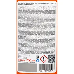 Средство для сантехники чистящее Effect/Alfa 109 0.75 л гель. Назначение: средство предназначено для профессиональной и бытовой чистки, удаления загрязнений с поверхностей унитазов, раковин, ванн, кафеля. Способ применения: унитазы - нанести средство под ободок и распределить внутри унитаза, выдержать не более 10 минут, почистить и смыть водой. При необходимости обработку повторить. Раковины, ванны - обработать средством и смыть водой. Кафельные поверхности - мыть раствором 50 мл средства на 1 л воды. Состав: 25%, но <15% ортофосфорная кислота; 25%, но <15 % АПАВ; <5 %: краситель, ароматизирующая добавка. Меры предосторожности: осторожно. При попадании в глаза вызывает выраженное раздражение. При попаданиях на кожу вызывает раздражение. Использовать резиновые перчатки или щетку. При попадании средства на кожу - промыть большим количеством воды (с мылом). При попадании в глаза - осторожно промыть водой в течение нескольких минут. При необходимости обратиться за медицинской помощью. Хранить в плотно закрытой упаковке, в недоступном для детей месте, отдельно от пищевых продуктов. Не смешивать с другими средствами бытовой химии. Не использовать для чистки чувствительных к действию кислот поверхностей: акрил, эмаль, мрамор, хромированные поверхности. Перед применением проверить стойкость поверхности в незаметном месте. Средство замерзает, после размораживания сохраняет свои свойства. В бытовых условиях и, при необходимости, средство утилизировать как бытовой отход. Срок годности: 36 месяцев.