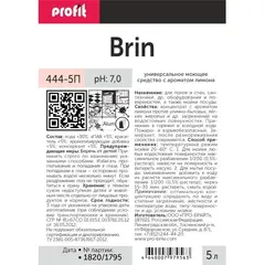 Универсальное моющее средство Profit Brin 5 л (концентрат) Назначение: для мытья посуды, полов и стен, сантехники, др. оборудования и поверхностей. Область применения: торговые и деловые центры, медицинские, образовательные, научные, финансовые, спортивно-оздоровительные, культурно-досуговые и иные учреждения, гостиницы и вокзалы, авиа- и ж/ж транспорт, в быту. Свойства: жидкий нейтральный концентрат с ароматом лимона против улично- бытовых, легких жировых и др. загрязнений на водостойких поверхностях. Применим в горячей и холодной воде. Пожаро- и взрывобезопасный. Замерзает, после размораживания свойства сохраняются. Способ применения: Температурный режим мойки 20°C -85°C. Для мойки посуды замачиванием: добавить в ванну с водой из расчета максимального разбавления 1:200 (5 мл + 995 мл воды = 1 л 0,5% раствора), через 15-30 минут растереть и смыть водой. Использовать концентрат, нанести на поверхность, растереть и смыть водой. Для мойки любых водостойких поверхностей: максимальное разбавление 1:200 (5 мл + 995 мл воды = 1 л 0,5% раствора), нанести на поверхность и вытереть насухо. Примечание: оптимальную концентрацию определять по виду и степени загрязнения, типу поверхности и другим условиям мойки. Состав: вода >30%, аПАВ <5%, краситель <5%, ароматизирующая добавка <5%, консервант <5%. Плотность: 1 г/см3 при 20°C. Значение pH раствора: 7,0. Меры предосторожности: беречь от детей! Использовать резиновые перчатки. Избегать проглатывания и попадания в глаза. При попадании в глаза промыть водой, при необходимости обратиться к врачу. Условия хранения: хранить плотно закрытым в заводской упаковке в темном сухом и недоступном детям и животным месте отдельно от пищевых продуктов и кормов. Срок годности: 3 года от даты изготовления при соблюдении условий транспортировки и хранения.