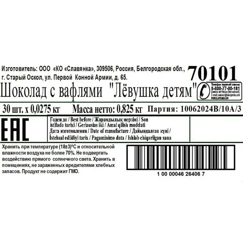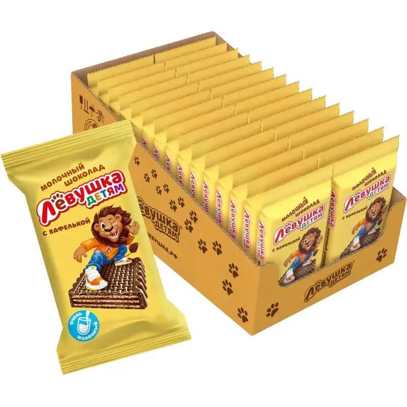 Шоколад "Левушка детям" с вафелькой - это оригинальный продукт, состоящий из молочного шоколада и вафли с шоколадной начинкой. Состав: сахар, масло какао, какао-тертое, заменитель масла какао (масла растительные, эмульгаторы (Е492, лецитин соевый), антиокислитель концентрат смеси токоферолов), молоко цельное сухое, сыворотка молочная сухая, мука пшеничная, какао-порошок, крахмал кукурузный, продукты яичные, эмульгаторы (лецитин соевый, эфиры полиглицерина и взаимоэтерифицированных рициноловых кислот), молоко сухое обезжиренное, ароматизатор, соль, пищевые волокна из отрубей: клетчатка пищевая, масло кокосовое, разрыхлитель гидрокарбонат натрия, вкусоароматическая добавка экстракт мускатного ореха, регулятор кислотности лимонная кислота. Пищевая ценность: белки - 6,0 г, жиры - 32,0 г, углеводы - 57,0 г. Энергетическая ценность: 540 ккал. Условия хранения: хранить при температуре от 15 до 21 С и относительной влажности воздуха не более 70%. Не подвергать воздействию прямого солнечного света. Хранить в помещениях, не зараженных вредителями хлебных запасов.
