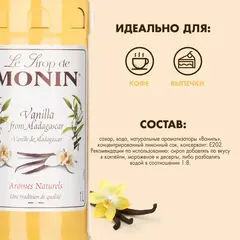Сиропы Monin выпускает одноименная французская марка, которая известна как лидирующий производитель алкогольных и безалкогольных сиропов в мире. Чтобы создать лучший ванильный сироп в мире, вы должны начать с лучшего ванильного экстракта в мире. На протяжении более 90 лет, Monin использовал премиальный экстракт ванили из Мадагаскара. Этот чистый экстракт дает сиропу Monin "Ваниль" превосходный вкус, что делает разницу в рецептах. Узнайте, как популярный сироп Monin Ваниль может улучшить практически любой напиток. Вкус: аромат стручка ванили в сочетании с экзотическими ароматами. Порошковый вкус и небольшой запах бренди. Принесет мягкость в кофе, десертные напитки, молочные коктейли, алкогольные или безалкогольные коктейли. Состав: сахар, вода, натуральные ароматизаторы (ваниль), концентрированный лимонный сок, консервант Е202. Рекомендации по использованию: сироп добавлять по вкусу в коктейли, мороженое и десерты, либо разбавлять водой в соотношении 1 к 8. Пищевая ценность: белки - 0 г; жиры - 0 г, в том числе, полиненасыщенные жирные кислоты - 0 г; углеводы - 80,2 г; в том числе - сахар (сахароза)- 79,8 г; соль - 0,01 г. Хранить в сухом месте, вдали от солнечных лучей при температуре от 10 до 25 градусов до истечения срока годности. Вскрытую бутылку хранить при температуре от 20 до 25 градусов не более 3-х месяцев вдали от солнечных лучей. Объем/вес: 1000 мл. Страна производства: Россия.