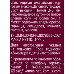 Гималайская соль Деловой стандарт в мельнице - натуральная соль в удобном формате. Соль содержит 84 микроэлемента, включая железо, благодаря которому она имеет розовый цвет. Сама соль обладает легким сладковато-соленым вкусом, который схож с привычной всем каменной солью. Она получила свое название из-за местонахождения - добывается преимущественно в гималайских горах, в Пакистане. Добавляя гималайскую соль в блюдо, Вы не только делаете его вкусным, но и обогащаете организм полезными веществами. Сорт высший. Помол 2-5 мм. Рекомендуемое суточное потребление соли не более 5-6 г. Может содержать следы орехов, горчицы, сельдерея, кунжута, глютена, молока. Хранить в сухом, хорошо вентилируемом помещении при относительной влажности воздуха не более 75%. Беречь от прямых солнечных лучей. После вскрытия упаковки хранить герметично закрытыми при рекомендуемых условиях в пределах срока годности. Возможно слеживание продукта. Масса нетто: 100 г. Срок годности: 48 месяцев с даты изготовления. Страна производства: Россия.