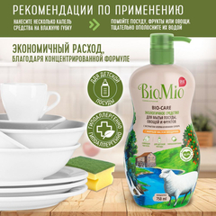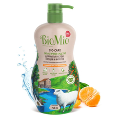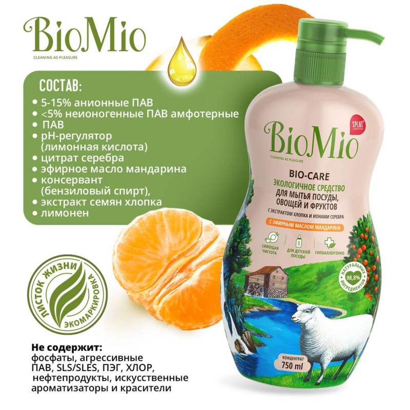 Средство для мытья посуды BioMio Bio-Care мандарин 750 мл. Назначение: экологичное средство для мытья посуды Bio-Care с эфирным маслом мандарина - это эффективное средство с мягким безопасным действием, которое идеально подходит для мытья детской посуды, овощей и фруктов. Специальная формула с экстрактом хлопка оказывает мягкое действие на кожу рук, а аромат мандарина успокаивает и снимает усталость. Концентрированная формула обеспечивает экономичный расход. Отлично подходит для использования в домах с автономной канализацией. Не содержит: фосфаты, агрессивные ПАВ, SLS/SLES, ПЭГ, хлор, нефтепродукты, искусственные ароматизаторы и красители. Безопасно для планеты. Способ применения: нанесите несколько капель средства на влажную губку. Помойте посуду, фрукты или овощи. Тщательно ополосните их водой. Меры предосторожности: хранить в недоступном для детей месте. Состав: 5-15% анионные ПАВ; 5% неионогенные ПАВ, амфотерные ПАВ, pH-регулятор (лимонная кислота), антисептический агент (цитрат серебра), эфирное масло мандарина, консервант (бензиловый спирт), экстракт семян хлопка, лимонен. Условия хранения: хранить вдали от источников тепла и прямых солнечных лучей.